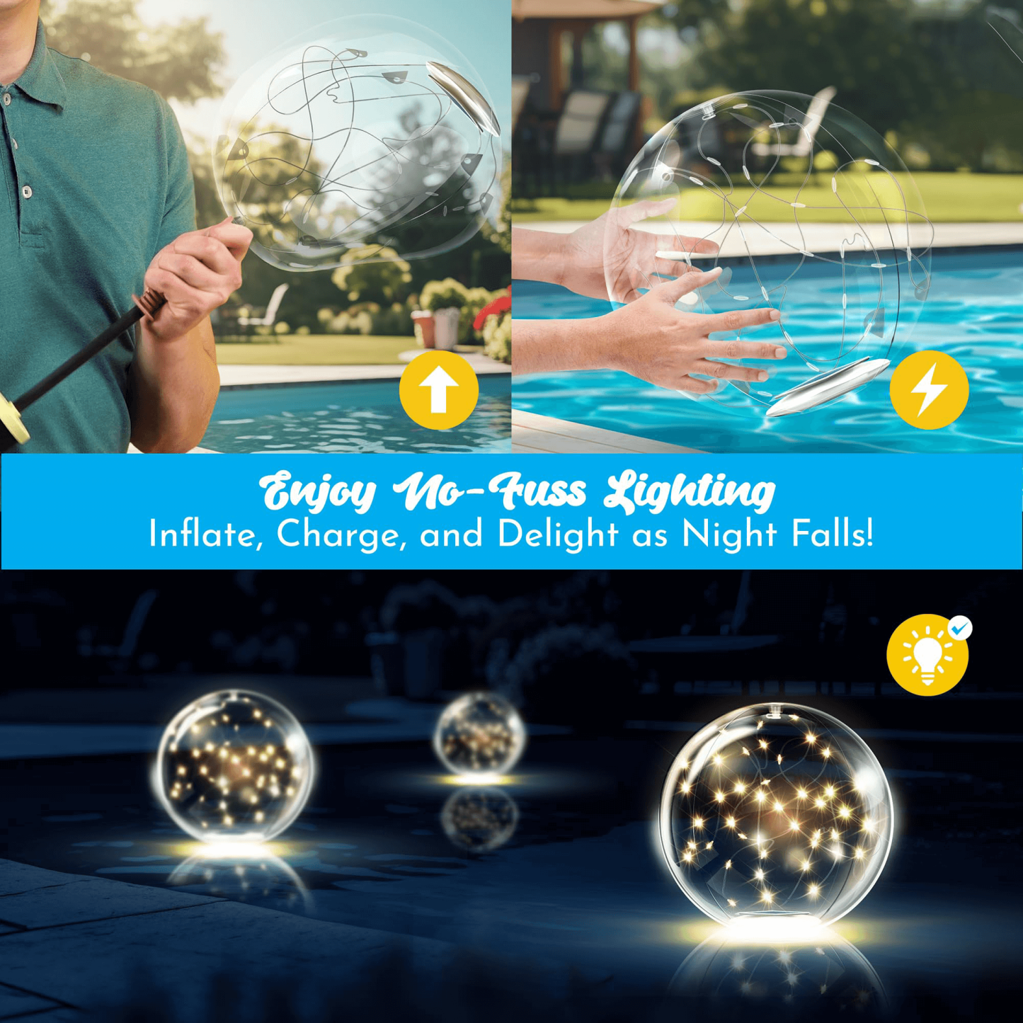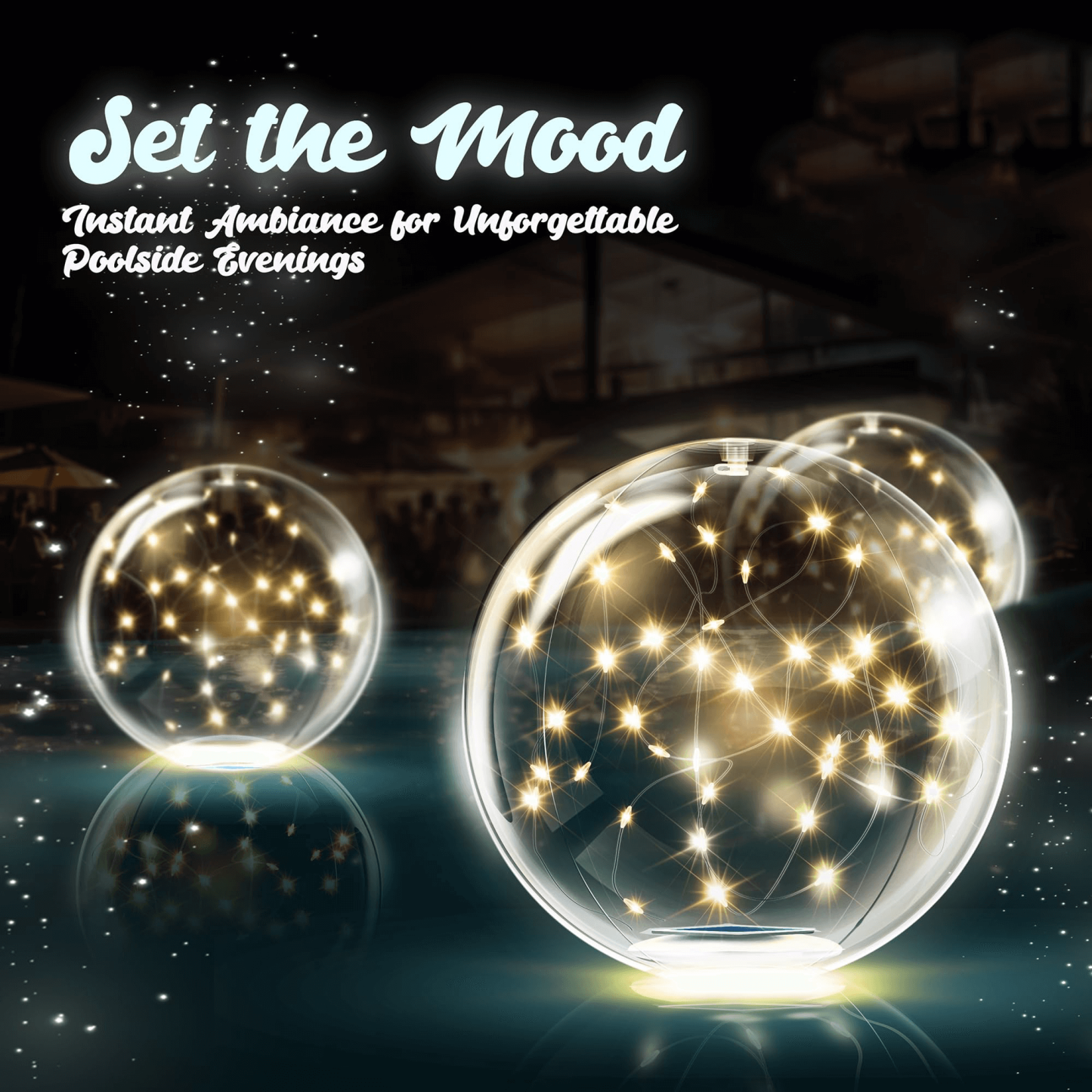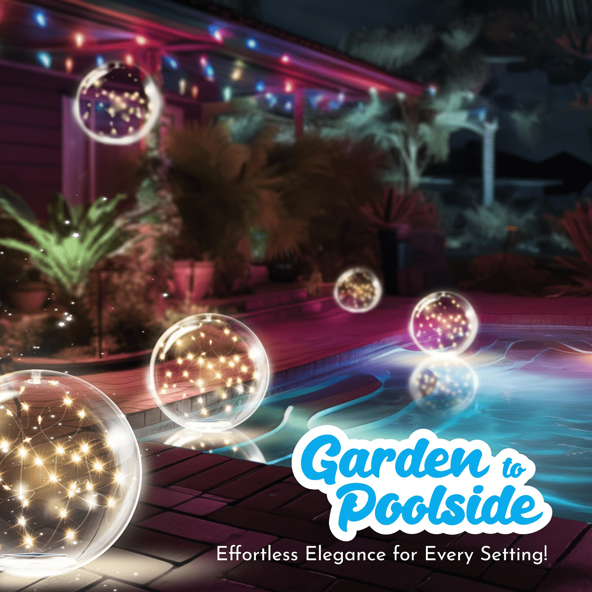 Elevate your outdoor décor with sophisticated solar-powered pool lighting. Designed with glamorous internal string lights, these inflatable LED glow balls enhance any setting, from backyard pools and patios to garden pathways and outdoor parties. Their sleek, modern design blends seamlessly with any aesthetic, turning ordinary spaces into extraordinary retreats.