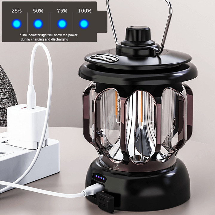 The camping lamp has an input and output port with a 5000MAH rechargeable lithium battery. It's also a USB emergency charger to charge cell phones and other USB-powered devices.