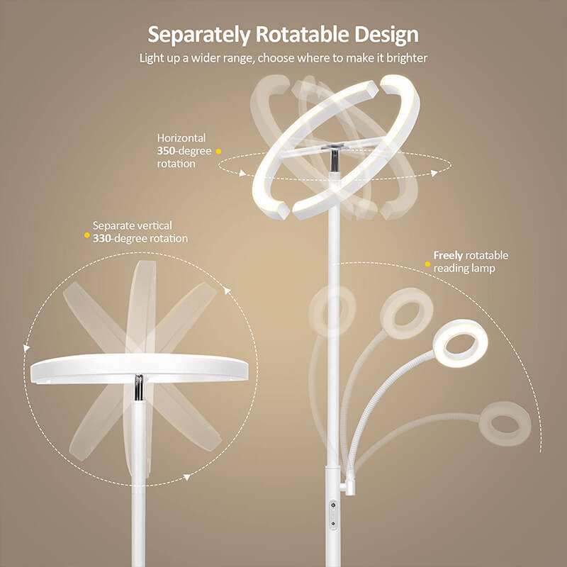 Illuminate any space precisely using the Split Rotatable Floor Lamp, featuring two semi-circular rings that independently rotate to cover a wide area. Adjust each head to 330 degrees horizontally and 350 degrees vertically to brighten your home, bedroom, or office exactly where needed.