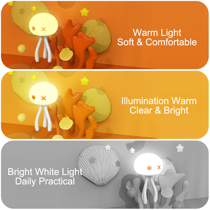 This unique jellyfish night light is peculiar and cute. The triangle bracket can be deformed at will for multiple scenes. It can be handheld, stand up, wind up, or be fixed on a stroller and baby bed.